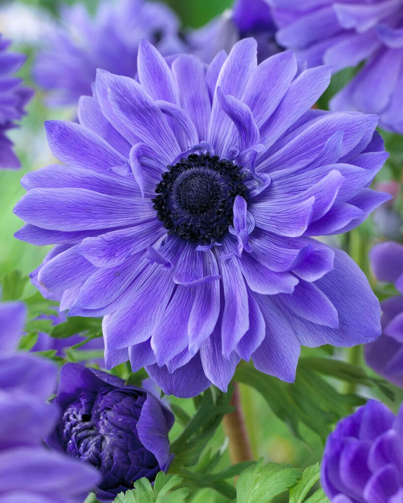A small tuberous perennial with mid-green leaves cut deeply into fine lobes and double purple-blue flowers which have a black centre during spring, after which they will die back until late autumn.