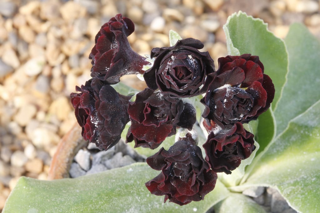 'Matthew Yates' is an evergreen, perennial, double auricula up to 20cm tall with rosettes of pale grey-green leaves. Very dark red, almost black, double flowers are produced in clusters on short stems in spring