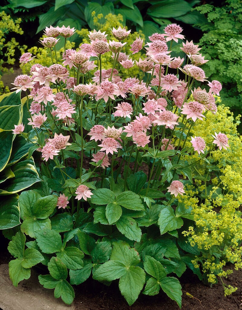 Astrantia are clump-forming herbaceous perennials with palmately lobed basal leaves and branched, erect, wiry stems bearing compact umbels of tiny flowers surrounded by a rosette of showy bracts
