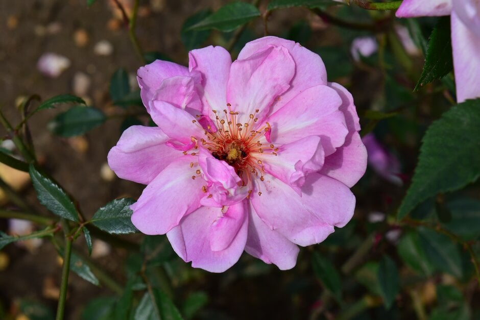 Rosa can be deciduous or semi-evergreen shrubs or scrambling climbers, with usually thorny stems bearing compound pinnate leaves and solitary or clustered flowers. Flowers may be followed by showy red or purple fruits in some varieties.