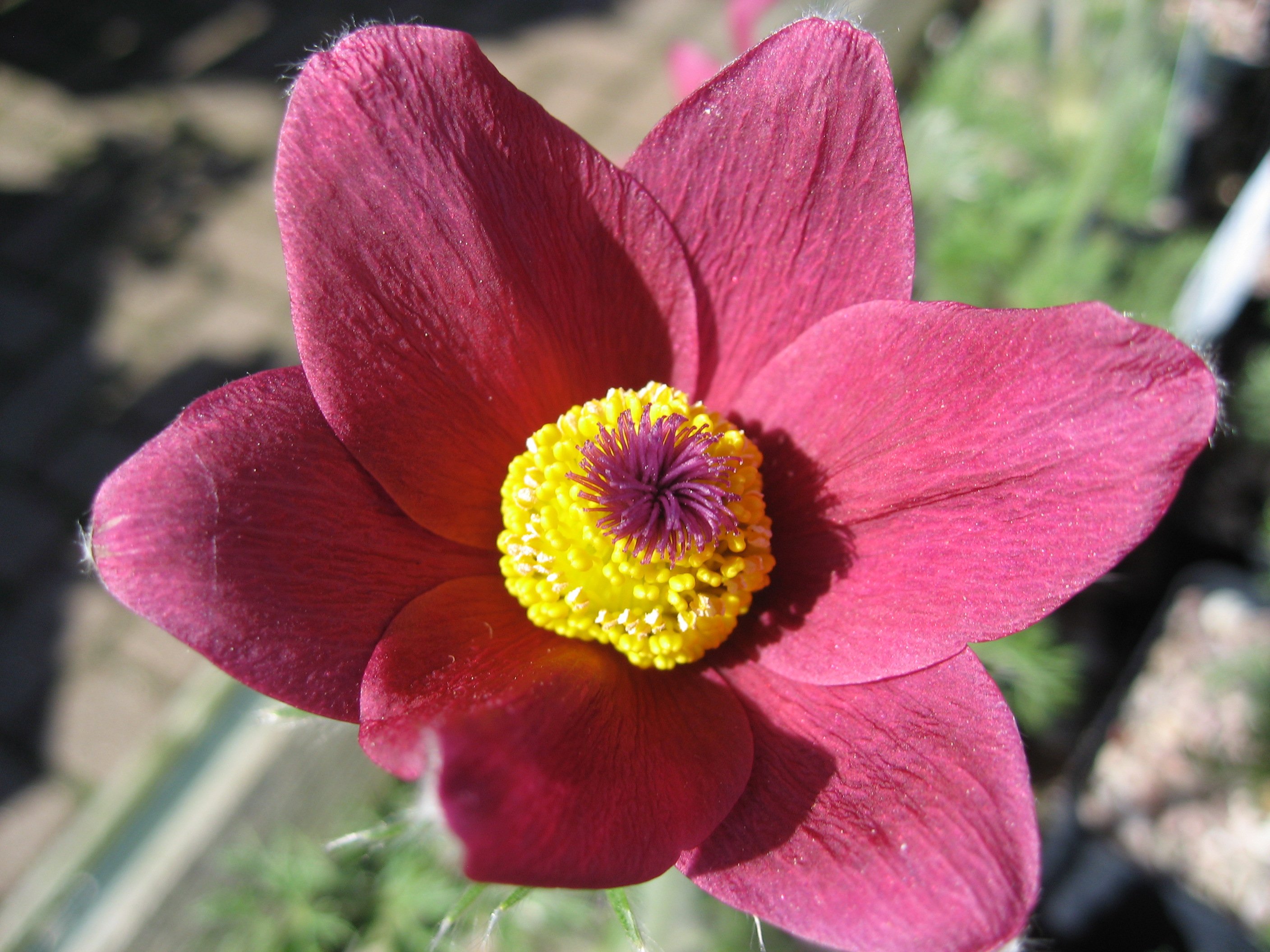 A compact, clump-forming perennial, to 15cm tall, with finely-divided leaves that are silky when young. In spring, flowers comprising deep red petals surrounding a central boss of yellow stamens are held on erect stems and are followed by silky seedheads