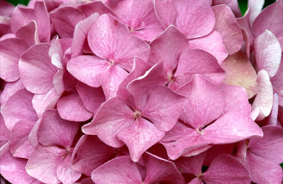 Hortensia hydrangeas (also known as mopheads) are compact bushy deciduous shrubs with broadly ovate leaves and rounded flower clusters composed almost entirely of showy sterile flowers