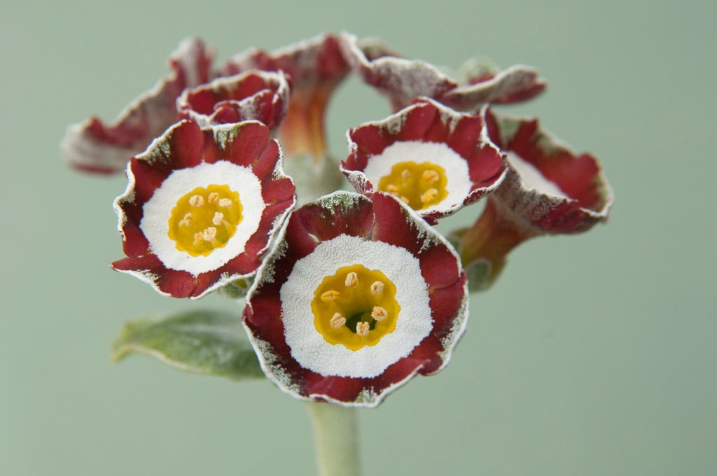 - Show Auricula group primulas have a distinct pure white circle in the centre of each flower. They can be single-coloured, edged with black feathering out to the margins, or fancy (edged with coloured feathering).