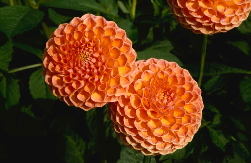Dahlia are tuberous rooted perennials with pinnately divided leaves and showy flowerheads, double in many cultivars, in summer and autumn