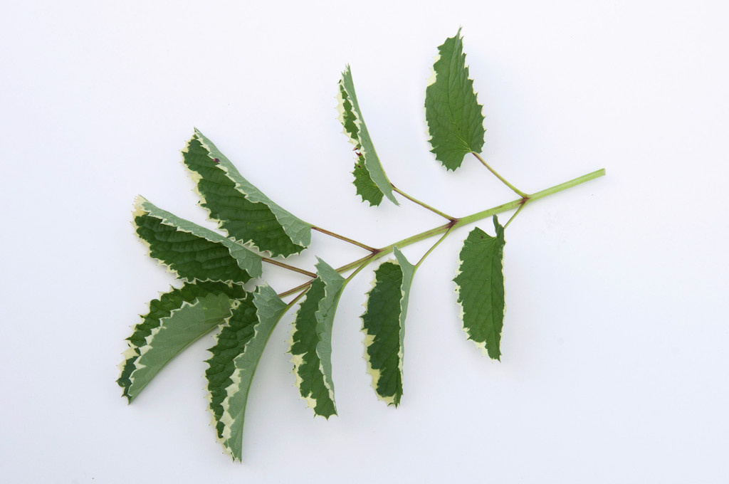 'Shiro-fukurin' is a clump-forming perennial to 1.2m tall. The greyish-green leaflets are toothed and variegated with white edges. Erect, burgundy-red flowerheads, up to 3cm long, are borne on widely-branched stems in summer