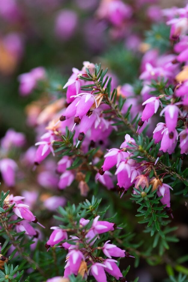 Erica can be prostrate or erect, evergreen shrubs with fine, needle-like leaves in whorls, and racemes or panicles of small, bell-shaped or tubular flowers