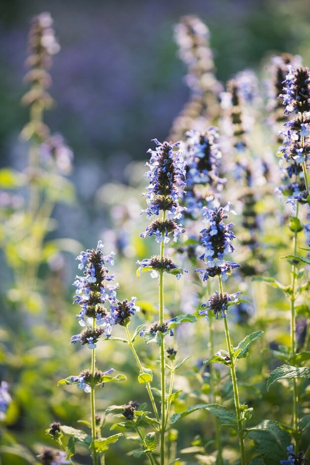 An upright, aromatic, clump-formingperennial to 70cm, with branching stems and toothed,bright green leaves.From mid-summer to mid-autumn produces spires of light purplish-blue flowers, with deep purple calyces, arranged in whorls