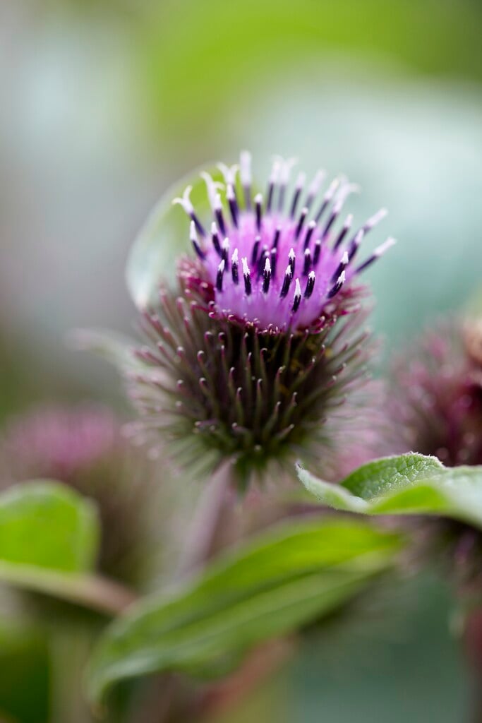 Arctium are robust, tap-rooted biennials with large downy leaves and solitary or clustered thistle-like flower-heads turning into burr-like fruiting heads