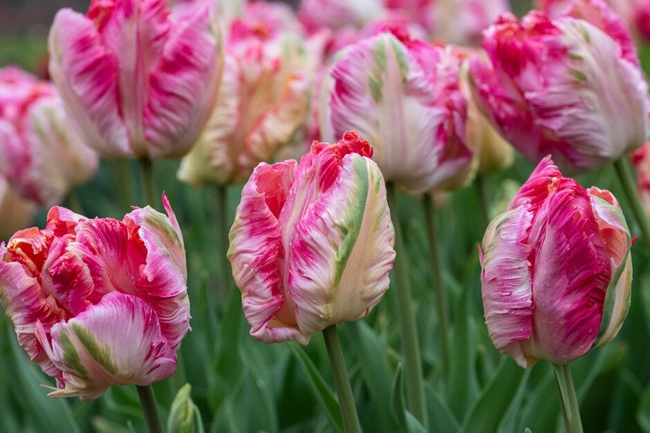 - Parrot Group tulips have single flowers, open cup-shaped, the tepals with finely cut margins and usually striped with contrasting colours, opening in mid to late spring