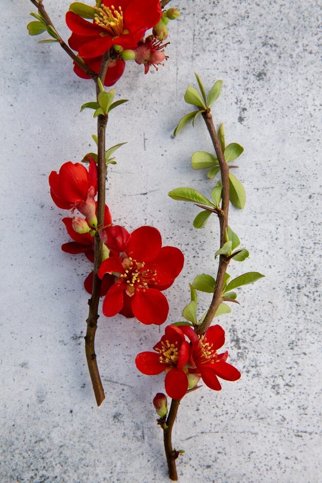 A short, spiny deciduous shrub about 1m tall, of spreading habit, with glossy, mid-green leaves. Single, deep crimson-red flowers with prominent golden anthers, are followed by aromatic green fruit ripening to yellow in autumn. These can be used to make jams and jellies but please see notes on toxicity for further advice