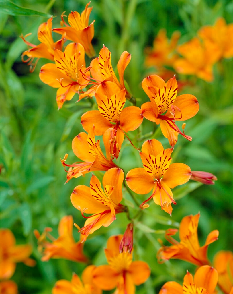 Alstroemeria are fleshy rooted herbaceous perennials forming spreading clumps of erect stems bearing narrowly lance-shaped leaves, with umbels of showy funnel-shaped flowers in summer
