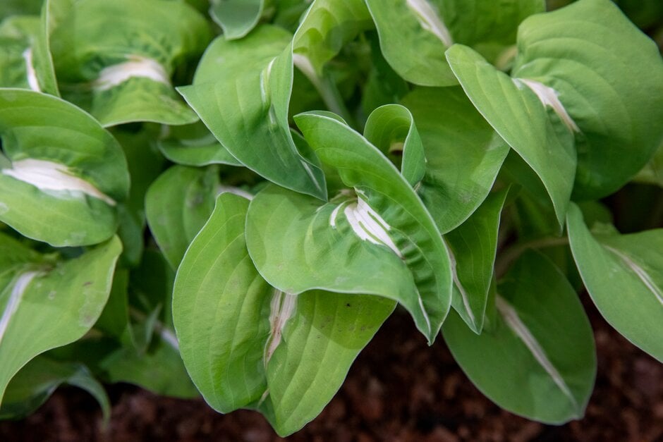 Hosta are clump-forming herbaceous perennials with simple, ovate or lance-shaped leaves, often attractively coloured or variegated, and erect racemes of nodding, funnel or bell-shaped flowers in early summer