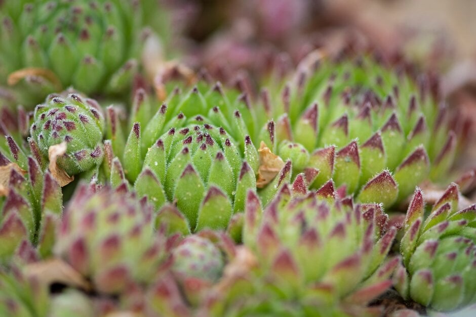 Sempervivum are evergreen perennials forming mats of fleshy-leaved rosettes, often attractively coloured, with star-shaped pink or pale yellow flowers in summer