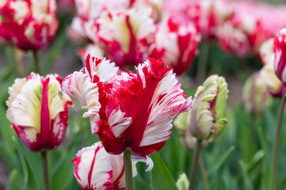 - Parrot Group tulips have single flowers, open cup-shaped, the tepals with finely cut margins and usually striped with contrasting colours, opening in mid to late spring