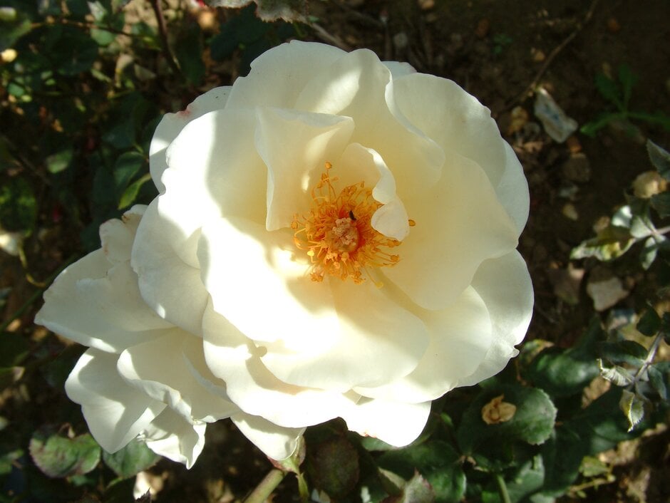 Elegant, upright rose about 1.2m tall, with lustrous dark green leaves. Clusters of very fragrant, semi-double, ivory blooms fade to white with the palest creamy-yellow centre and open to show long golden stamens and red filaments, repeat-flowering from summer to autumn