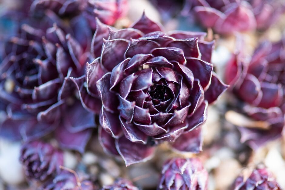 Sempervivum are evergreen perennials forming mats of fleshy-leaved rosettes, often attractively coloured, with star-shaped pink or pale yellow flowers in summer