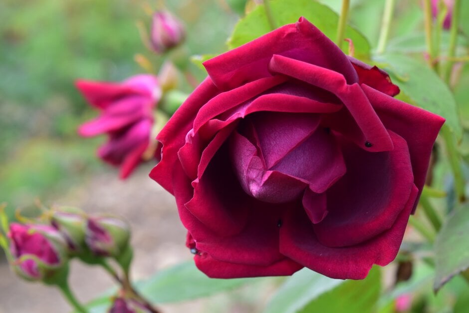 Rosa can be deciduous or semi-evergreen shrubs or scrambling climbers, with usually thorny stems bearing compound pinnate leaves and solitary or clustered flowers. Flowers may be followed by showy red or purple fruits in some varieties.