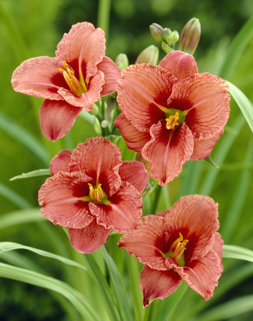 Hemerocallis may be evergreen or herbaceous perennials, with narrow, strap-shaped leaves and funnel-shaped flowers on erect stems in late spring or early summer