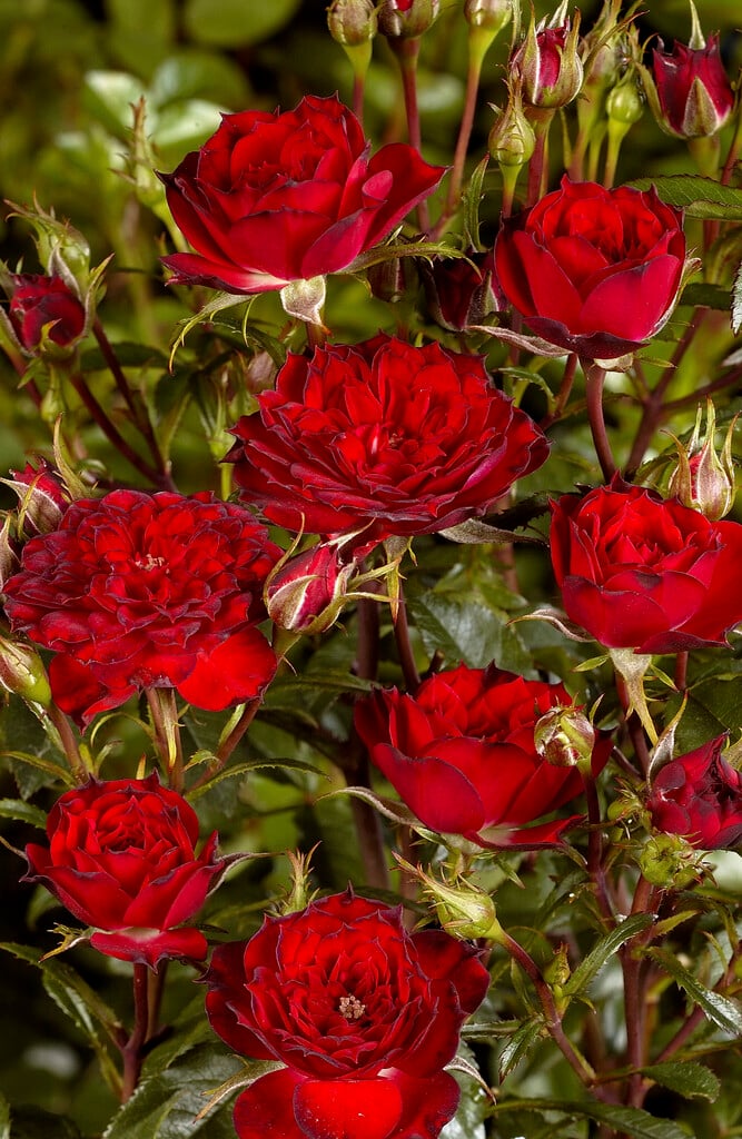 Miniature bushy rose about 30-40cm tall, with thorny stems, and leathery dark green leaves. Small clusters of fully double, vermillion-red blooms to 2.5cm wide produced in abundance from early summer to autumn