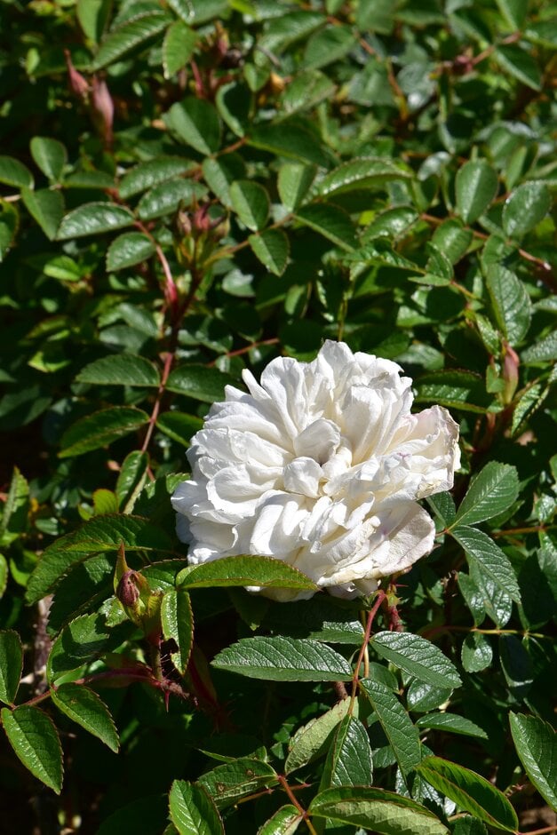 Large, dense, shapely shrubby rose about 1.8m tall and wide, with vigorous growth and healthy mid-green leaves. Fragrant, fully double, pure white rosette-like blooms, repeat-flowering in summer with occasional blooms later into autumn
