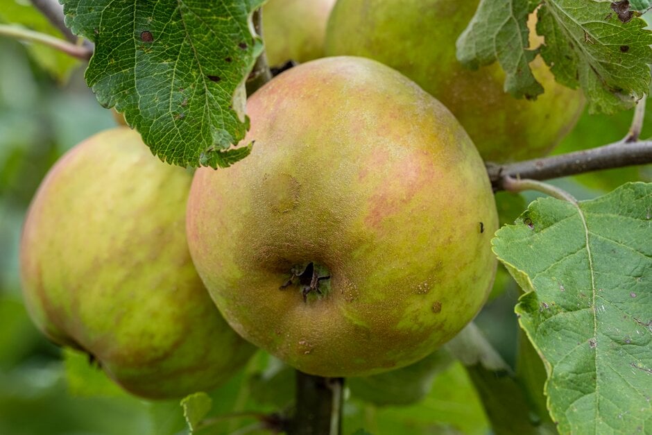 A mid-season dessert apple, with lightly russetted green skin with a dark red flush, and heavy, slightly yellow flesh with a nutty flavour. Requires a group 2, 3 or 4 pollinator
