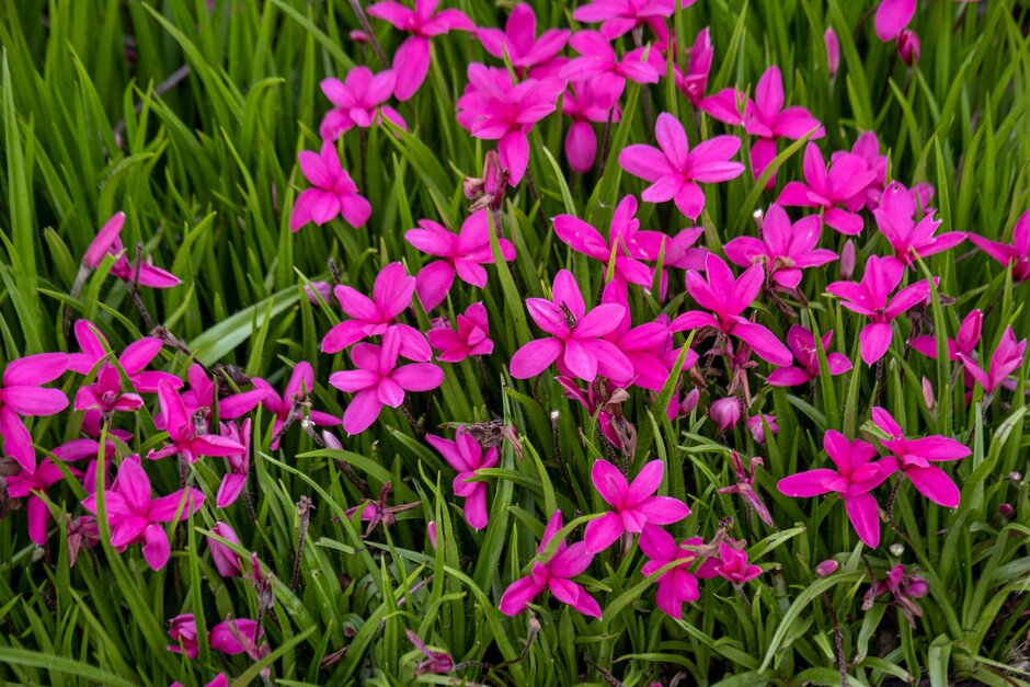 Rhodohypoxis are small clump-forming herbaceous perennials with tufts of hairy, narrowly lance-shaped leaves and solitary star-shaped, white, pink, red or purple flowers in summer