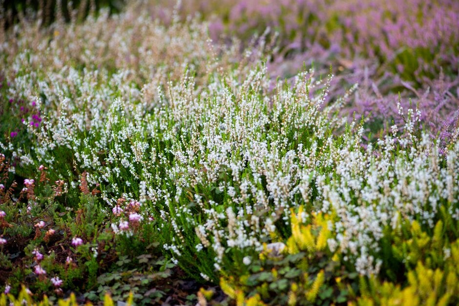 Calluna are low-growing or dwarf evergreen shrubs with stems clothed in tiny overlapping leaves, and terminal, spike-like racemes of small, 4-petalled flowers with coloured calyces