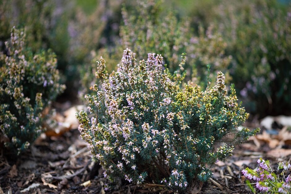 Erica can be prostrate or erect, evergreen shrubs with fine, needle-like leaves in whorls, and racemes or panicles of small, bell-shaped or tubular flowers