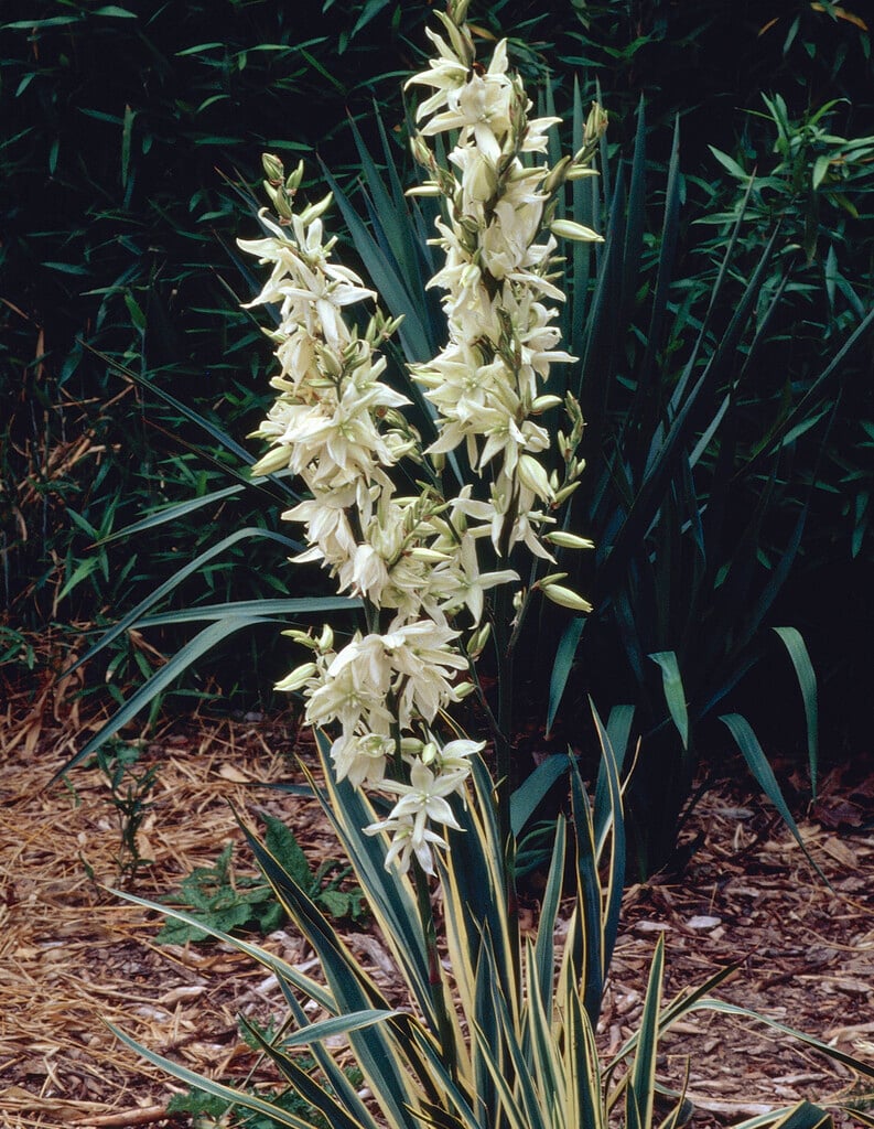 A small evergreen shrub forming clumps of erect or spreading, sword-shaped leaves to 60cm in length, clearly margined with creamy-white. Nodding, bell-shaped creamy-white flowers are borne in panicles to 2m in height