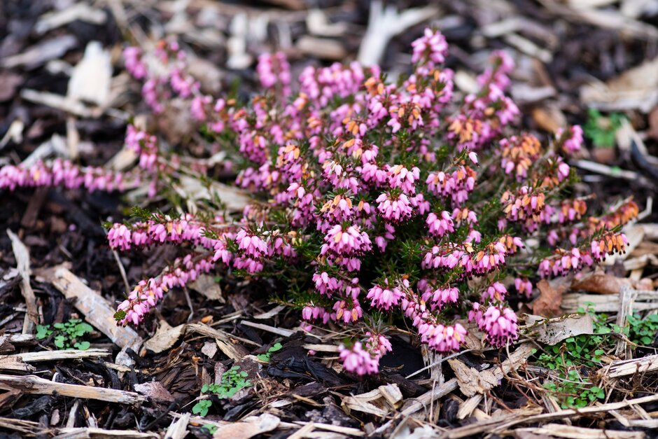 Erica can be prostrate or erect, evergreen shrubs with fine, needle-like leaves in whorls, and racemes or panicles of small, bell-shaped or tubular flowers