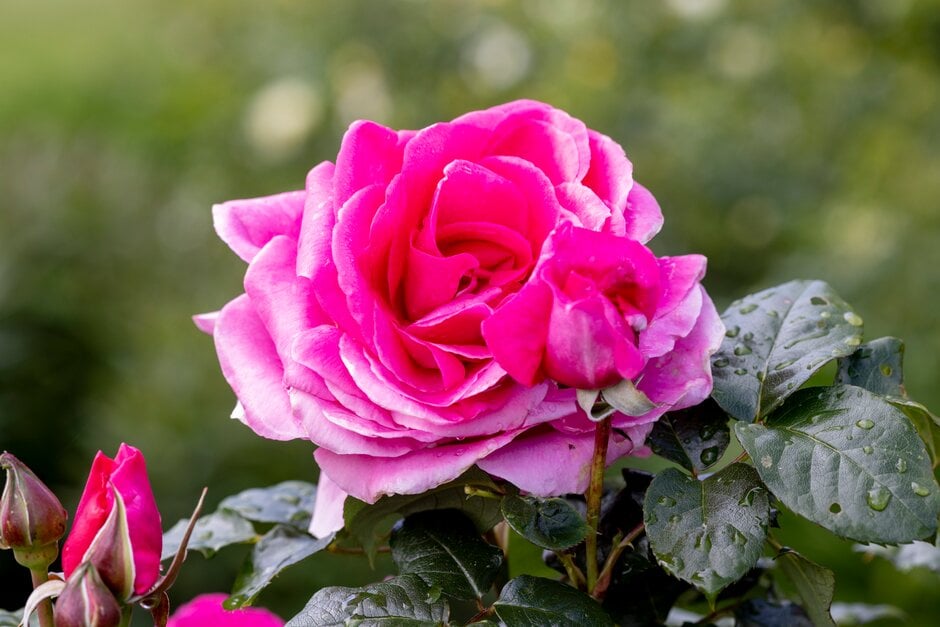 Rosa can be deciduous or semi-evergreen shrubs or scrambling climbers, with usually thorny stems bearing compound pinnate leaves and solitary or clustered flowers. Flowers may be followed by showy red or purple fruits in some varieties.