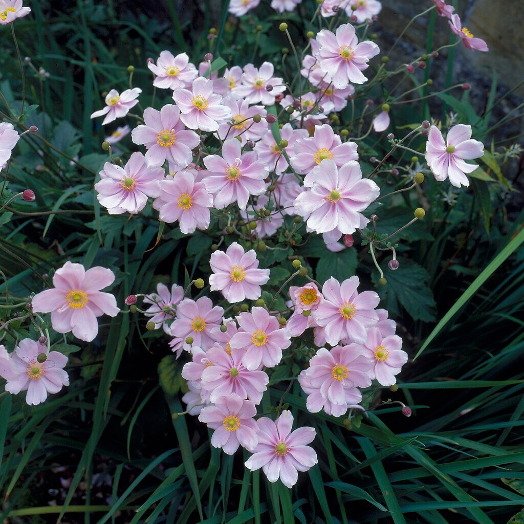 A branching, tall and graceful herbaceous perennial with mid-green toothed leaves which are divided into three lobes. Has large double or single flowers with a yellow centre in different shades of pink and white from summer to late autumn.