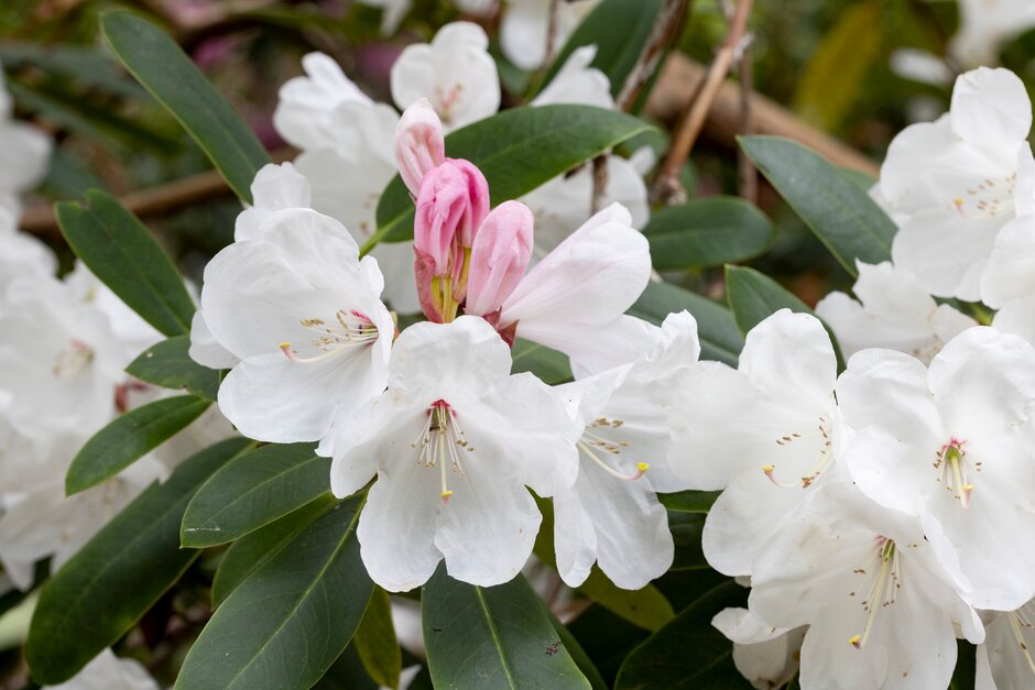 Large, evergreen, free-flowering Leonardslee hybrid over 2.5m tall, with dark green leaves and bearing dome-shaped trusses of large, lightly scented, funnel-shaped flowers, dark pink in bud, opening to pure white flowers with a small red basal blotch within each flower, in late spring