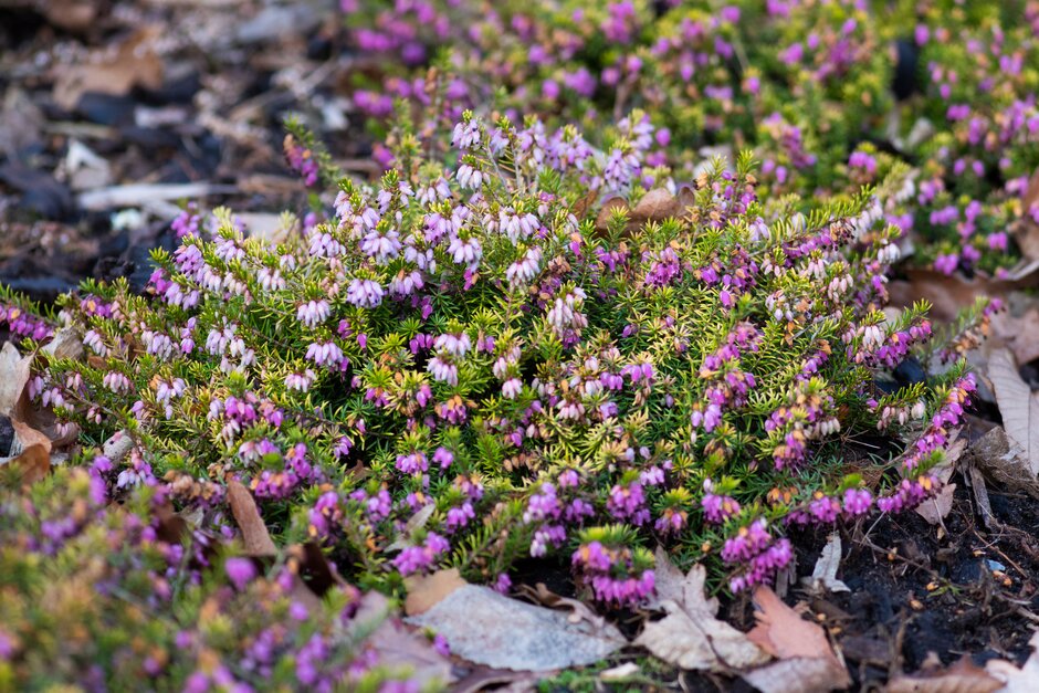 Erica can be prostrate or erect, evergreen shrubs with fine, needle-like leaves in whorls, and racemes or panicles of small, bell-shaped or tubular flowers