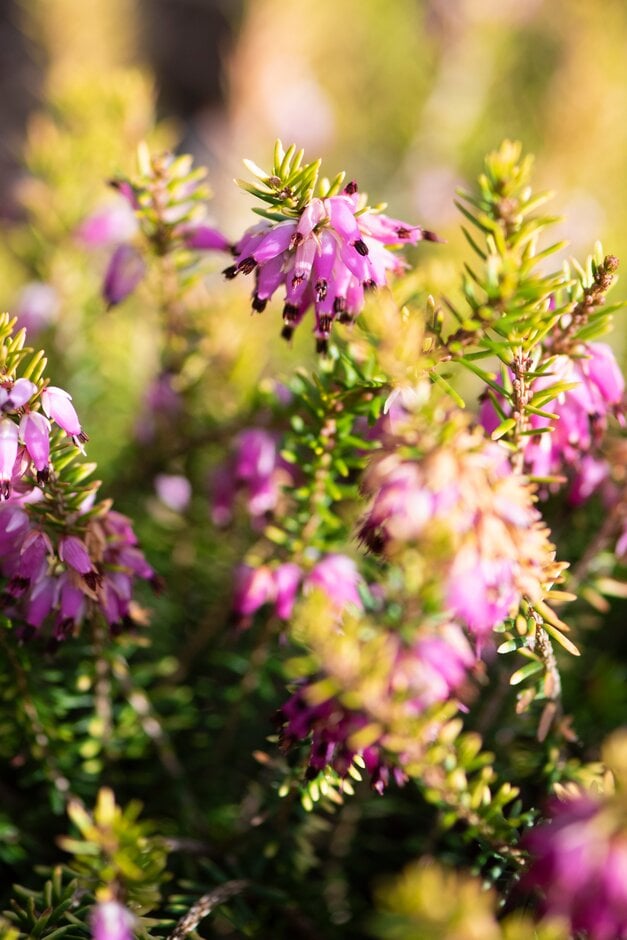 Erica can be prostrate or erect, evergreen shrubs with fine, needle-like leaves in whorls, and racemes or panicles of small, bell-shaped or tubular flowers