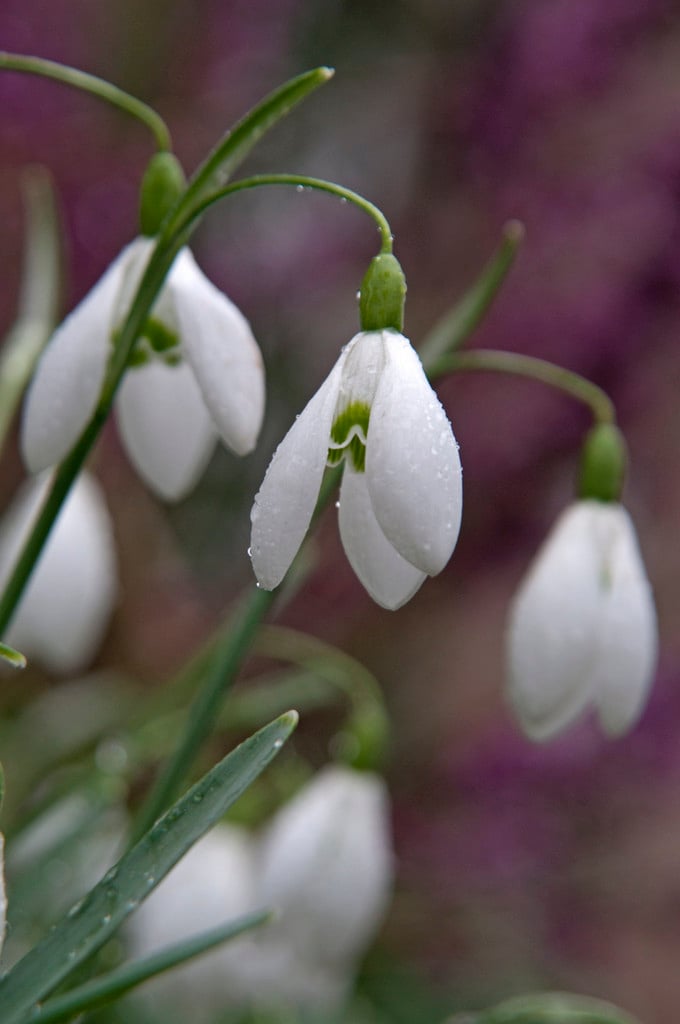 Galanthus are dwarf bulbous perennials with linear or strap-shaped leaves, and solitary, often honey-scented, nodding flowers with 3 white outer tepals and 3 smaller inner ones often marked with green