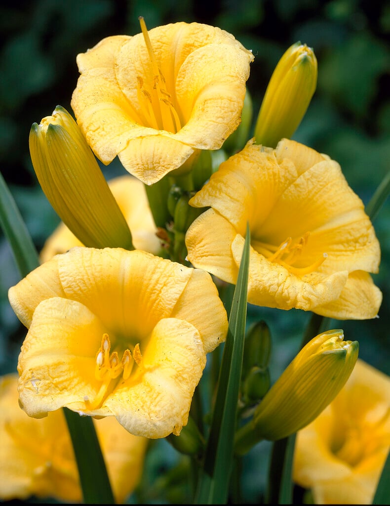 Hemerocallis may be evergreen or herbaceous perennials, with narrow, strap-shaped leaves and funnel-shaped flowers on erect stems in late spring or early summer