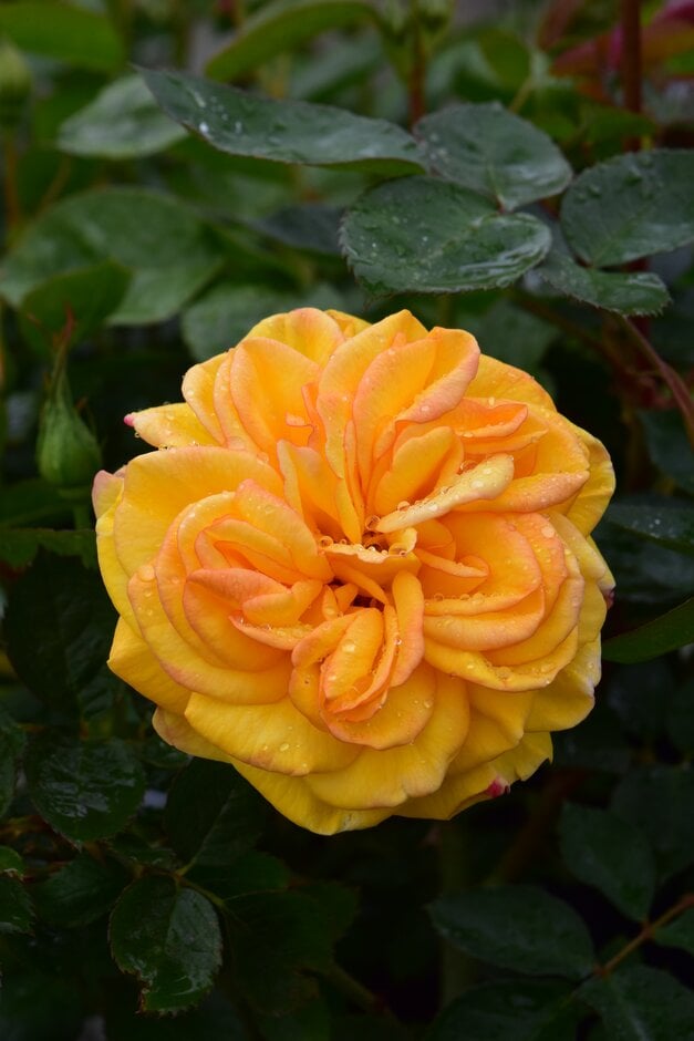 Small, bushy, upright rose about 60cm tall, with plentiful mid-green foliage, and bearing globular orange buds opening to clear bright yellow, fully double flowers, produced in large clusters and repeat-flower through summer and into autumn