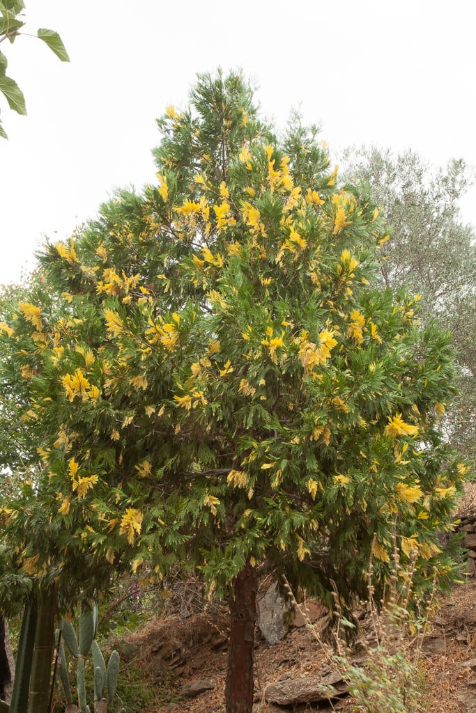 A slow-growing, columnar, coniferous tree to 4m tall, producing flat sprays of linear, glossy, scale-like dark green leaves with splashes of bright yellow. Cones are ovoid, 2.5cm, yellow-brown ripening to red-brown