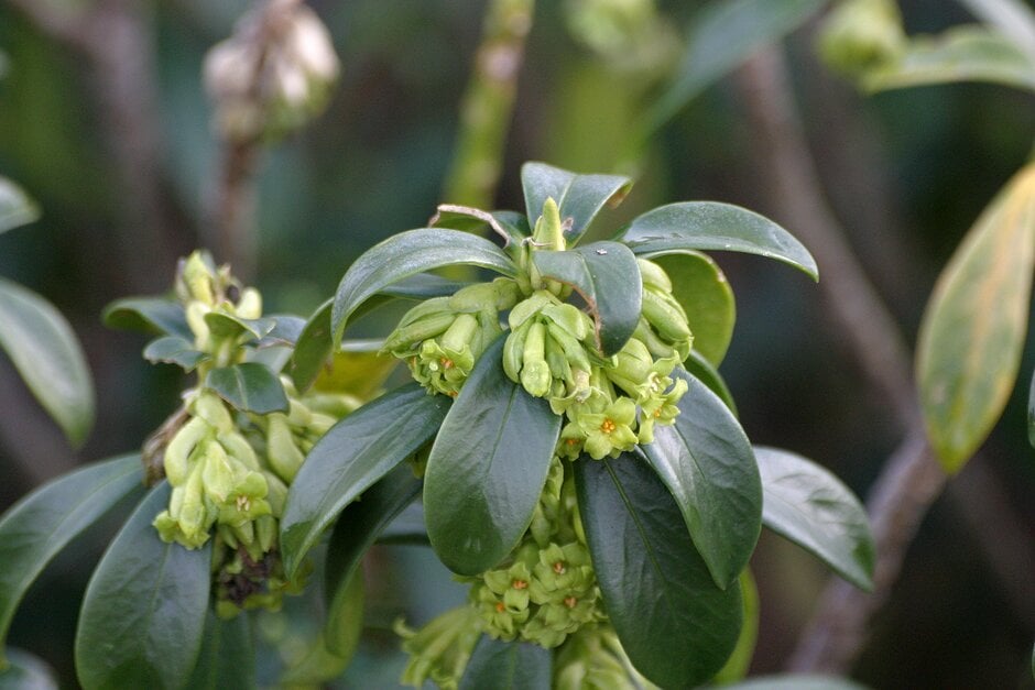 A compact evergreen shrub to 40cm, with glossy, leathery leaves. In late winter and early spring it produces clusters of fragrant, greenish-yellow flowers; these are followed by purple-black berries
