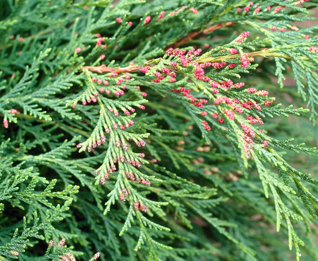 Chamaecyparis are evergreen trees, usually of narrowly ovoid or columnar outline, with much-branched sprays of small scale-like leaves, and small, globose cones; tiny red male cones are conspicuous in a few cultivars