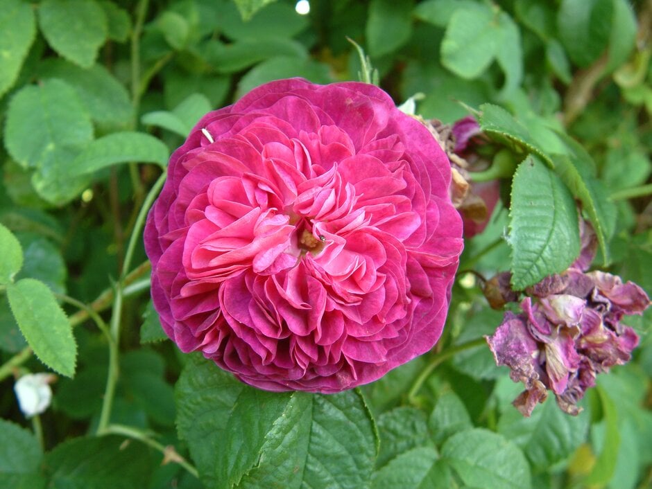 Vigorous upright rose about 1.2m tall, with thorny stems and lush greyish-green foliage. Large clusters of free-flowering, round buds open to highly fragrant, fully double, deep, glowing pink blooms with paler undersides, up to 10cm across, and once-flowering in midsummer