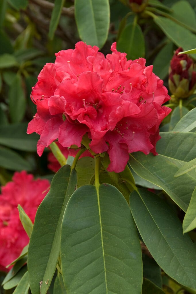 Rhododendron can be evergreen or deciduous shrubs or trees, with simple leaves, sometimes with a dense colourful indumentum of hairs on the lower side, and funnel-shaped, bell-shaped or tubular flowers that may be solitary or in short racemes