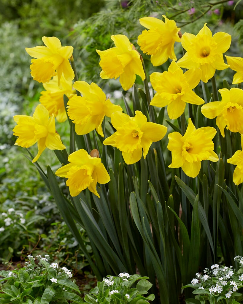 A trumpet daffodil to around 50cm high, with straplike, grey-green leaves. Early flowering, producing flowers to almost 11cm across, with bright yellow outer petals and a smooth yellow corona with a flared and ruffled rim