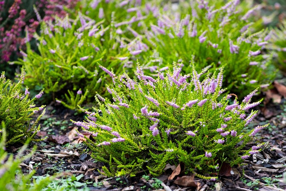 Calluna are low-growing or dwarf evergreen shrubs with stems clothed in tiny overlapping leaves, and terminal, spike-like racemes of small, 4-petalled flowers with coloured calyces