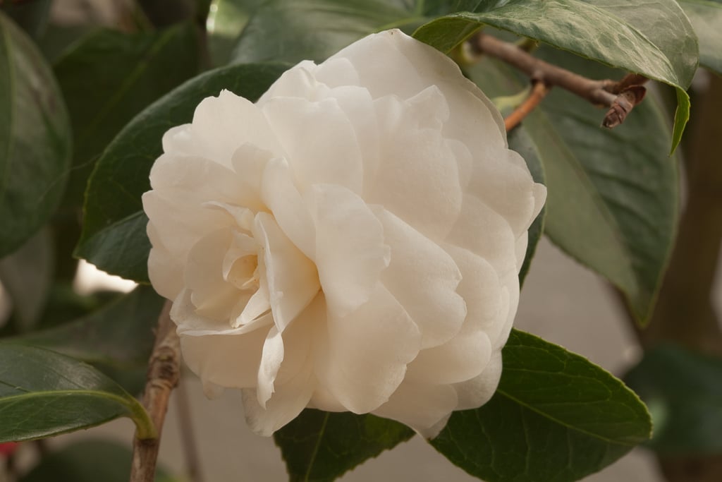 An evergreen shrub with dark green glossy leaves and very full, rose-like pure white double flowers which appear in the spring