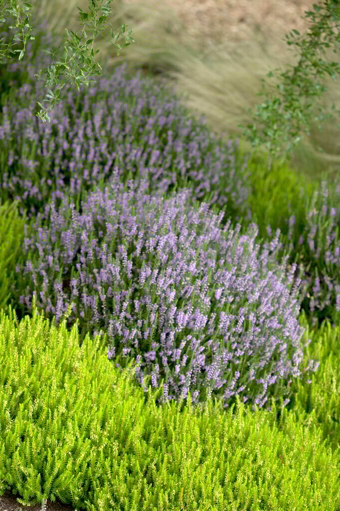A compact, bushy evergreen shrublet with upright branches bearing upright branches of tiny linear moderate green leaves tipped, pinky orange and red early in the season in winter and spring, cream and pink in summer and bearing short racemes of small lilac flowers from late summer into autumn, August to October
