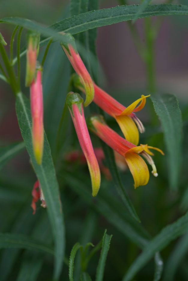 A herbaceous, woody-based, rhizomatous perennial to 60cm tall, with arching stems bearing long, very narrow leaves and 4cm long, tubular, red and yellow flowers singly in the upper leaf axils in late spring and summer