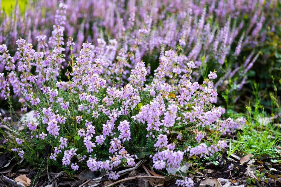 Erica can be prostrate or erect, evergreen shrubs with fine, needle-like leaves in whorls, and racemes or panicles of small, bell-shaped or tubular flowers