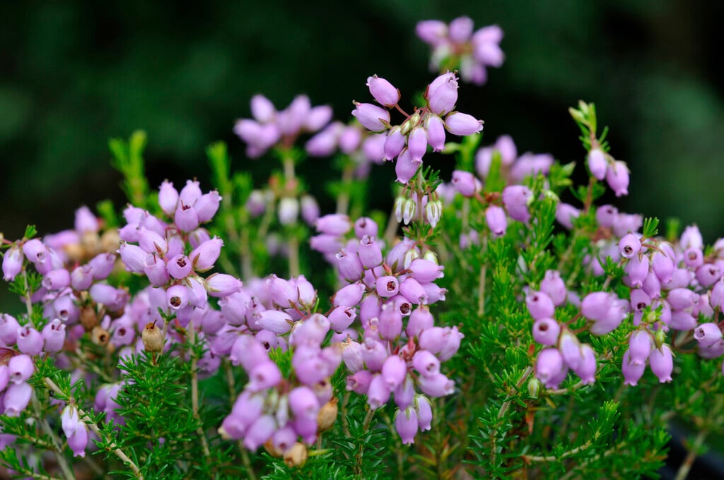 Erica can be prostrate or erect, evergreen shrubs with fine, needle-like leaves in whorls, and racemes or panicles of small, bell-shaped or tubular flowers